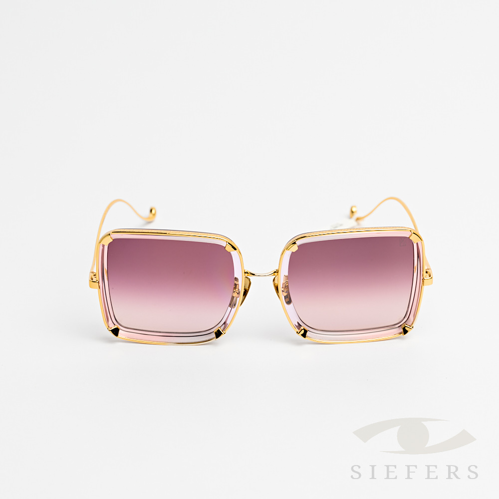 Dames zonnebril, Goud met gravering, gekrulde poot, titanium lichtgewicht met licht paarse/rood degrade glazen. Gelimiteerd 22/100