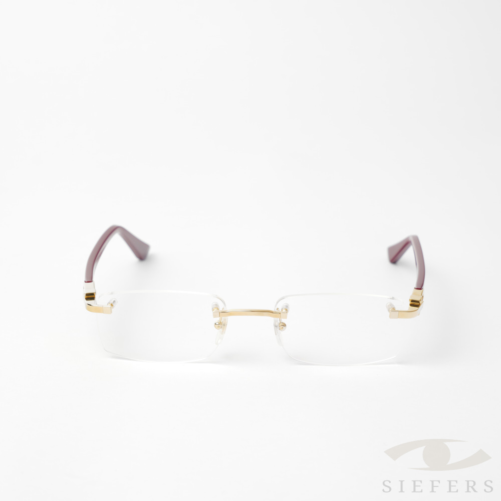 Optical rimless frame in burgundy acetate with metal gold- colored parts. Possible to customize the glasses