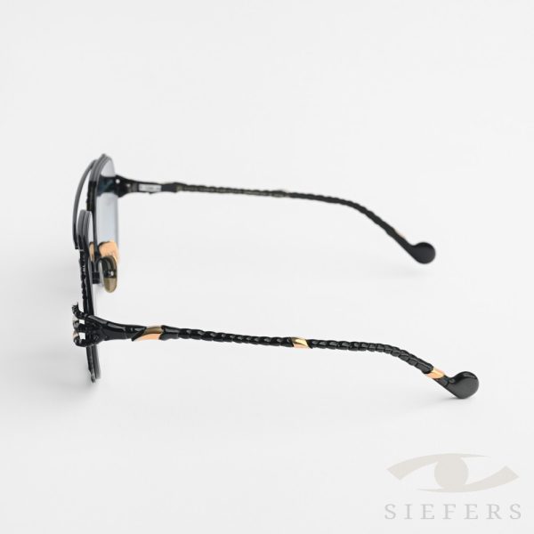 Features a custom jeweled Sterling silver beauty mark embedded in a crystallized temple tip. Constructivist details include